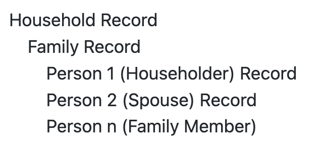 I have constructed the house, family, and person datasets from the 2022 CPS-ASEC data. To help you make sense of these datasets, I will note that the unit of observation in the house dataset is a household, that in the family dataset is a family, that in the person dataset is a person. The relationship among the three datasets is illustrated below: